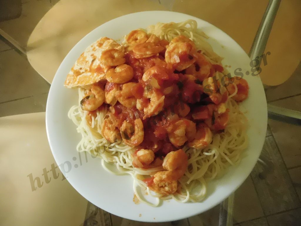Βγάζω τις γαρίδες να μην παραβράσουν, δυναμώνω τη φωτιά και βράζω λίγο ακόμα τη σάλτσα, να δέσει.